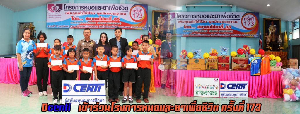 Dcenti เข้าร่วมโรงการหมอและยาเพื่อชีวิต เพิ่มคุณค่าให้ชีวิต ผูกมิตรประชาชนครั้งที่ 173 สนับสนุนทุนการศึกษาให้แก่น้องๆโรงเรียนบ้านหนองชาก ต.หนองชาก อ.บ้านบึง จ.ชลบุรี เมื่อวันที่ 10 พ.ย. ที่ผ่านมา โดย สมาคมโปคาดี้ 35 ผลตำรวจเอก เฉลิมเกียรติ ศรีวรขาน (นายกสมาคมฯ)